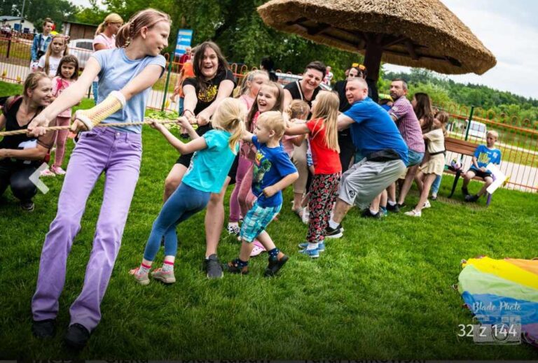 zabawy sportowe (przeciąganie liny, skoki w workach, tor przeszkód, rzuty do celu itd.